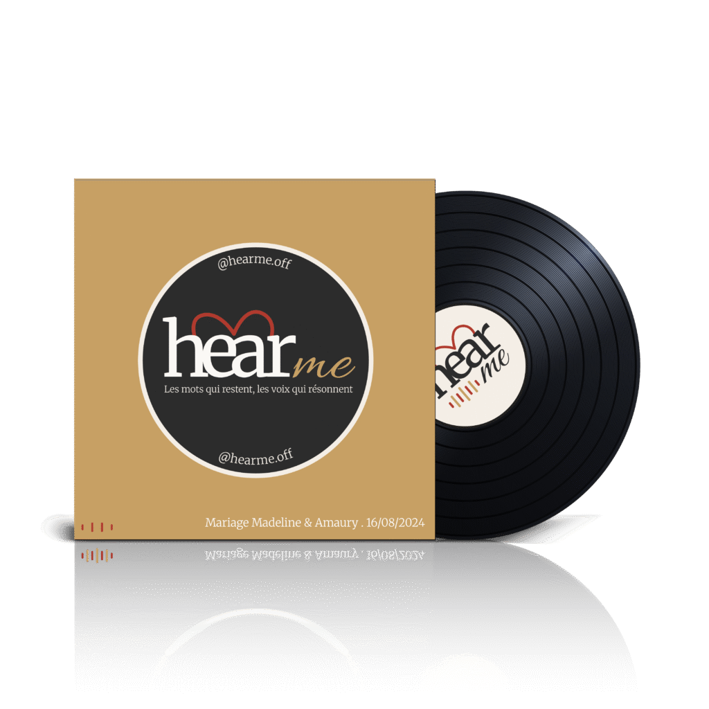 Nous vous offrons la possibilitĂ© de crĂ©er un vinyle entièrement personnalisĂ© avec l’enregistrement de votre livre d’or audio, oĂą vous pourrez choisir la pochette ainsi que la couleur du vinyle. Le service de gravure est disponible au prix de 175 euros, incluant la livraison partout en France. Cependant, si vous dĂ©cidez d’acheter le vinyle en mĂŞme temps que le pack HearMe, nous vous faisons une offre spĂ©ciale Ă 150 euros.